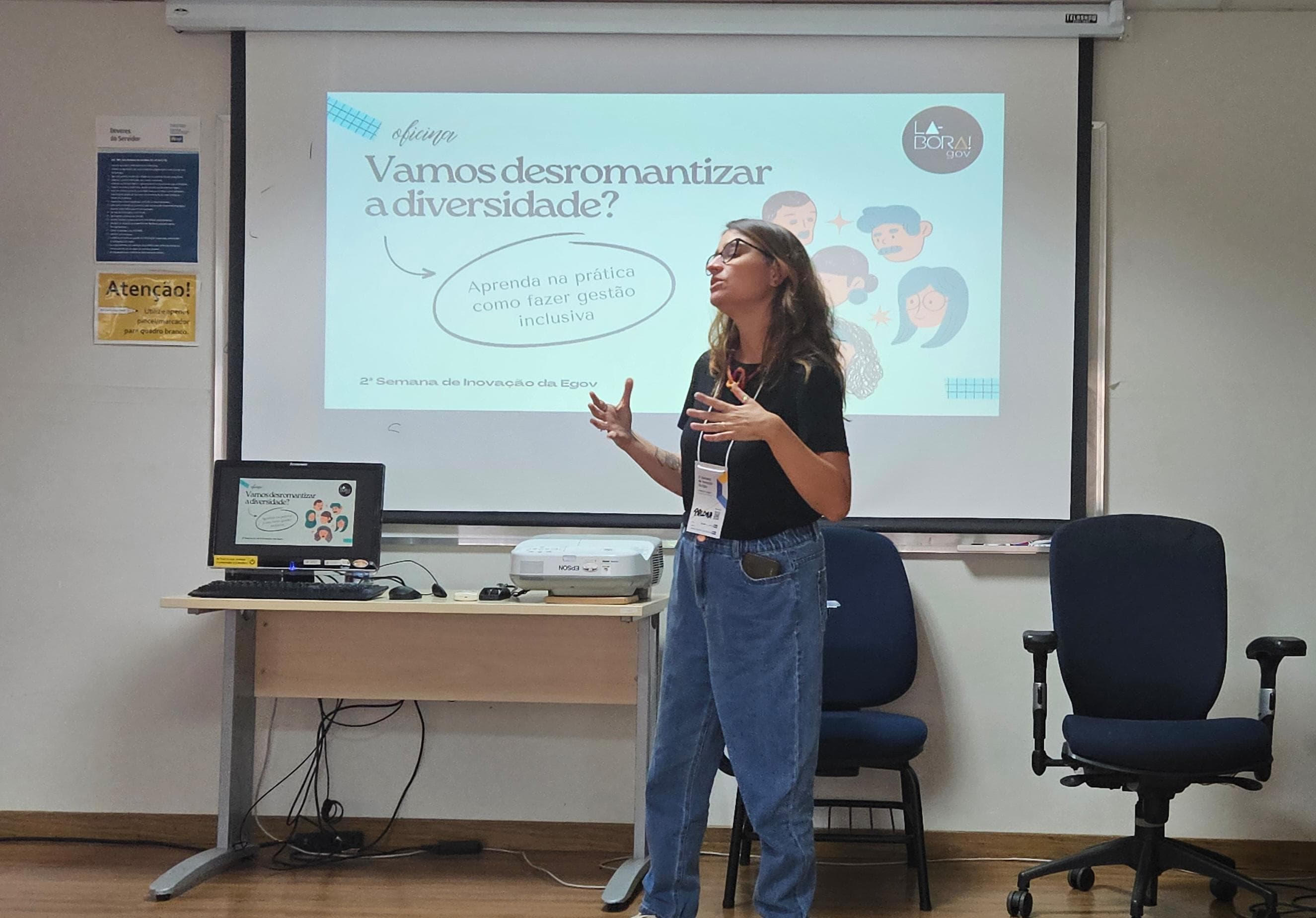 Já durante a tarde do segundo dia, as servidoras do time fixo Marthinha Lauande, Paloma Abelin, Marília Mesquita e Vítor Machiel, do Time Volante do laboratório, realizaram a oficina "Vamos desromantizar a diversidade? Aprenda na prática como fazer gestão inclusiva!". Essa oficina teve como objetivo principal desromantizar o conceito de diversidade, promovendo a inclusão no ambiente de trabalho de maneira prática e empática.
