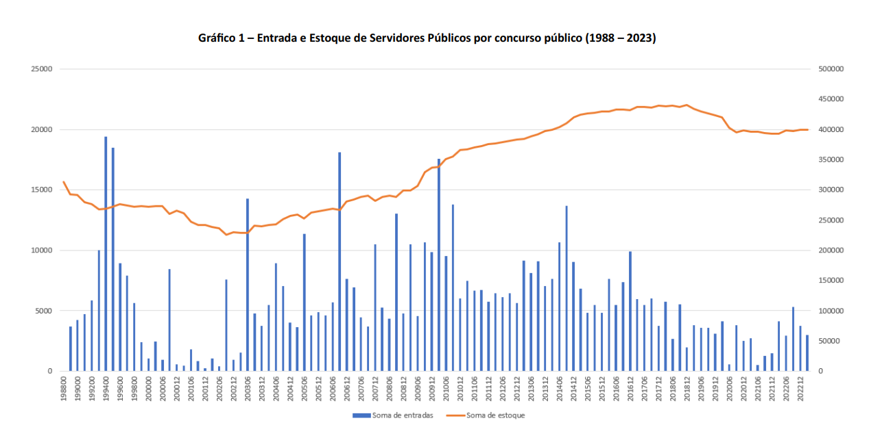 Abaixo, é possível visualizar o gráfico Entrada e Estoque de Servidores Públicos por concurso públicos (1988 - 2023) disponibilizado na Nota Técnica.