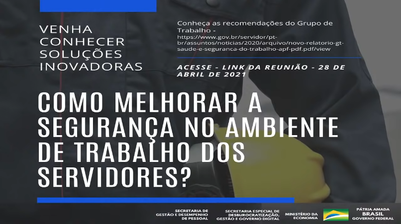 A Gestão de Pessoas tem um encontro virtual marcado com os Servidores nesta quarta-feira, dia 28 de abril de 2021, às 14 horas, no Dia Mundial da Segurança e da Saúde no Trabalho. Não perca a oportunidade de conhecer as propostas sobre as condições de segurança nos ambientes e processos de trabalho do serviço público federal. As sugestões foram feitas pelo Grupo de Trabalho - GT Interinstitucional (instituído pela Portaria nº 7.538/2018), e complementadas na Oficina virtual ocorrida em novembro de 2020.