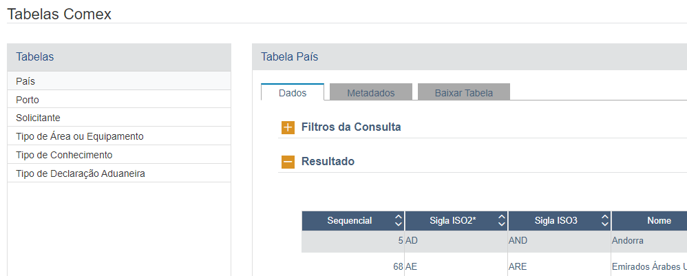 Nesta tela é possível consultar domínios ou realizar o download da tabela vigente: