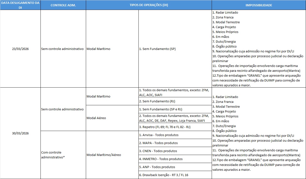 - Mercadorias com apenas um órgão anuente: o desligamento da Declaração de Importação (DI) ocorrerá na data indicada na tabela acima, exceto nos casos de impossibilidade de Duimp listados na última coluna da tabela.