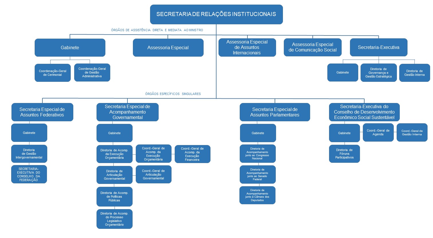 Nos termos do Decreto de nº 11.364, de 1º de janeiro de 2023 e suas alterações previstas nos Decretos nº 11.650, de 16 de agosto de 2023 , nº 12.012, de 2 de maio de 2024 e nº 12.523, de 24 de junho de 2025, a Secretaria de Relações Institucionais tem a seguinte estrutura organizacional.