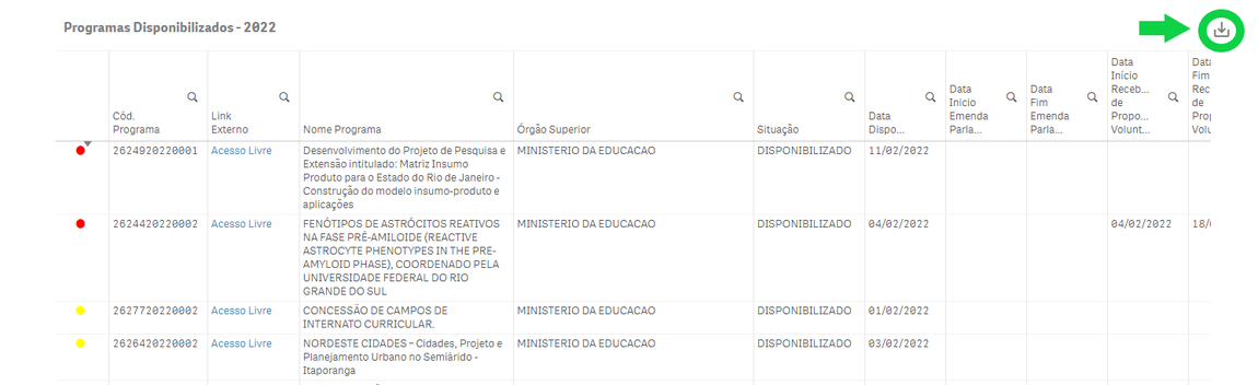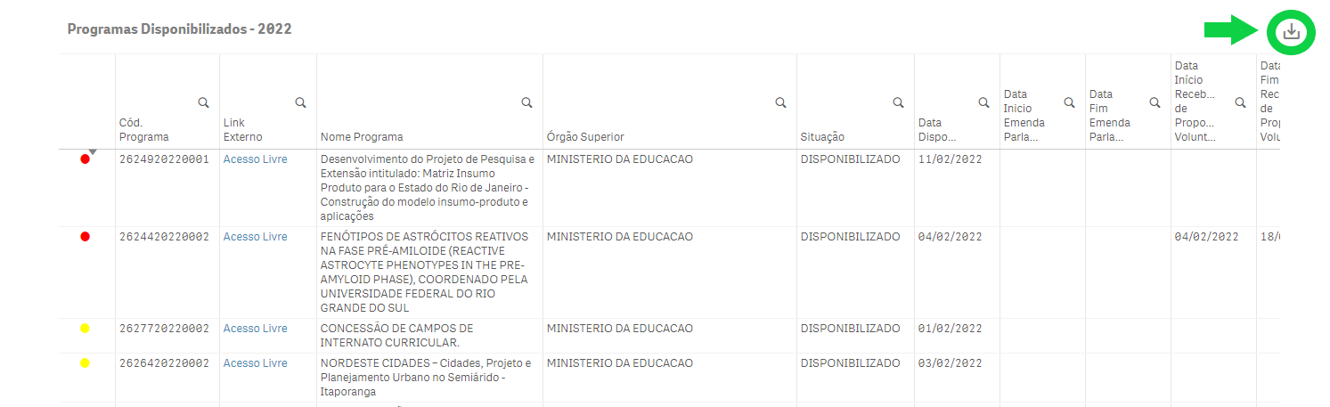 Pronto! Esses são os Programas do Governo Federal que estão abertos para receber propostas de parcerias com OSCs no momento que a sua busca foi feita. O download pode ser feito no ícone indicado na imagem.