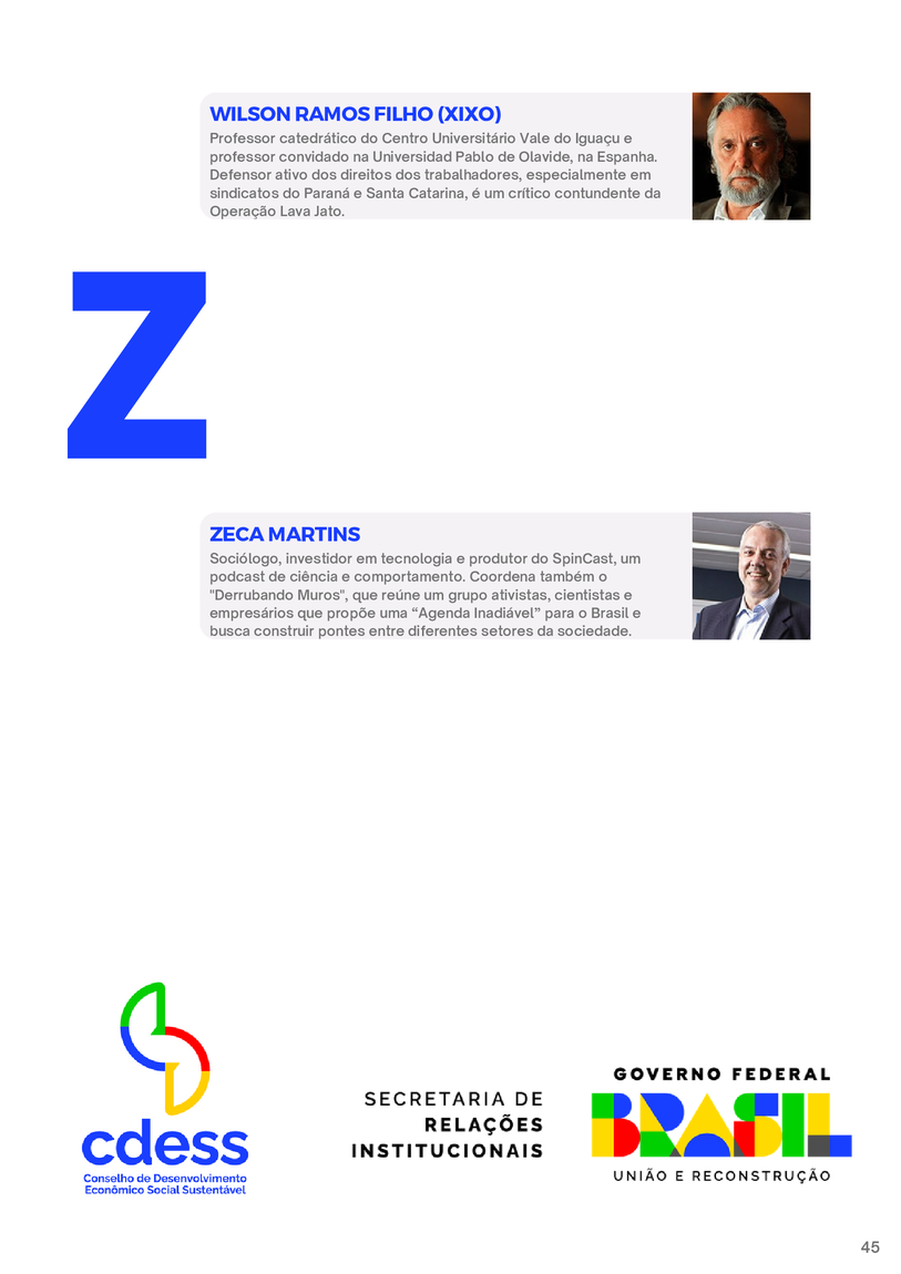A escolha dos integrantes do Conselho de Desenvolvimento Econômico e Social Sustentavel (CDESS) é feita pelo presidente da República em função da trajetória profissional, da influência e da disposição de cada um para prestar contribuições relevantes à agenda de desenvolvimento do Brasil. As conselheiras e os conselheiros são pesquisadores, empresários, sindicalistas, artistas e outros profissionais das mais diversas áreas, que colocam sua experiência e espírito público a serviço do país. Constituem um fórum qualificado para a discussão de políticas públicas e a proposição de medidas que estimulem o crescimento econômico, o desenvolvimento e a equidade social.