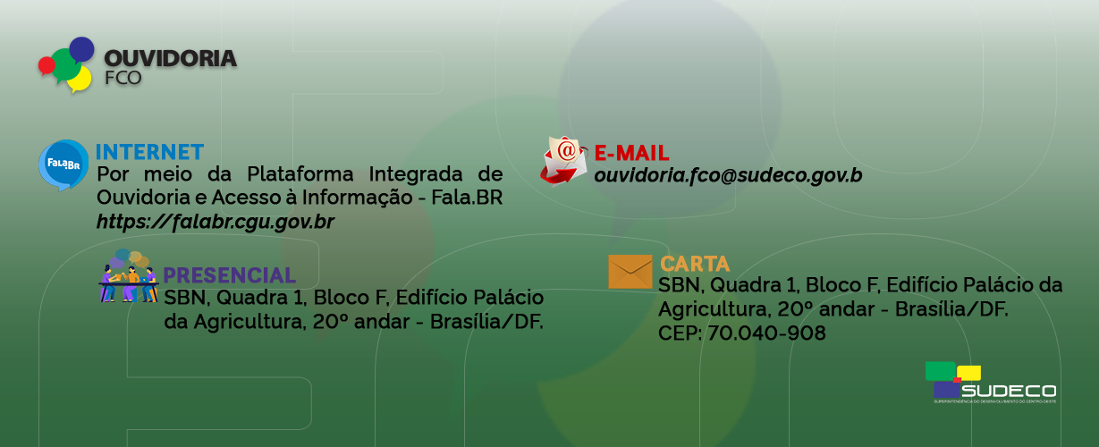 A Ouvidoria foi criada para facilitar a comunicação entre os(as) usuários(as) e os administradores do FCO. Qualquer cidadão(ã) pode procurar a nossa Ouvidoria para solicitar informações, sugerir melhorias, reclamar ou denunciar sobre o serviço disponibilizado pelas instituições financeiras e/ou cooperativas de crédito que operam com recursos do FCO. Esta atitude contribui para a qualidade dos serviços oferecidos à região Centro-Oeste com recursos do FCO!