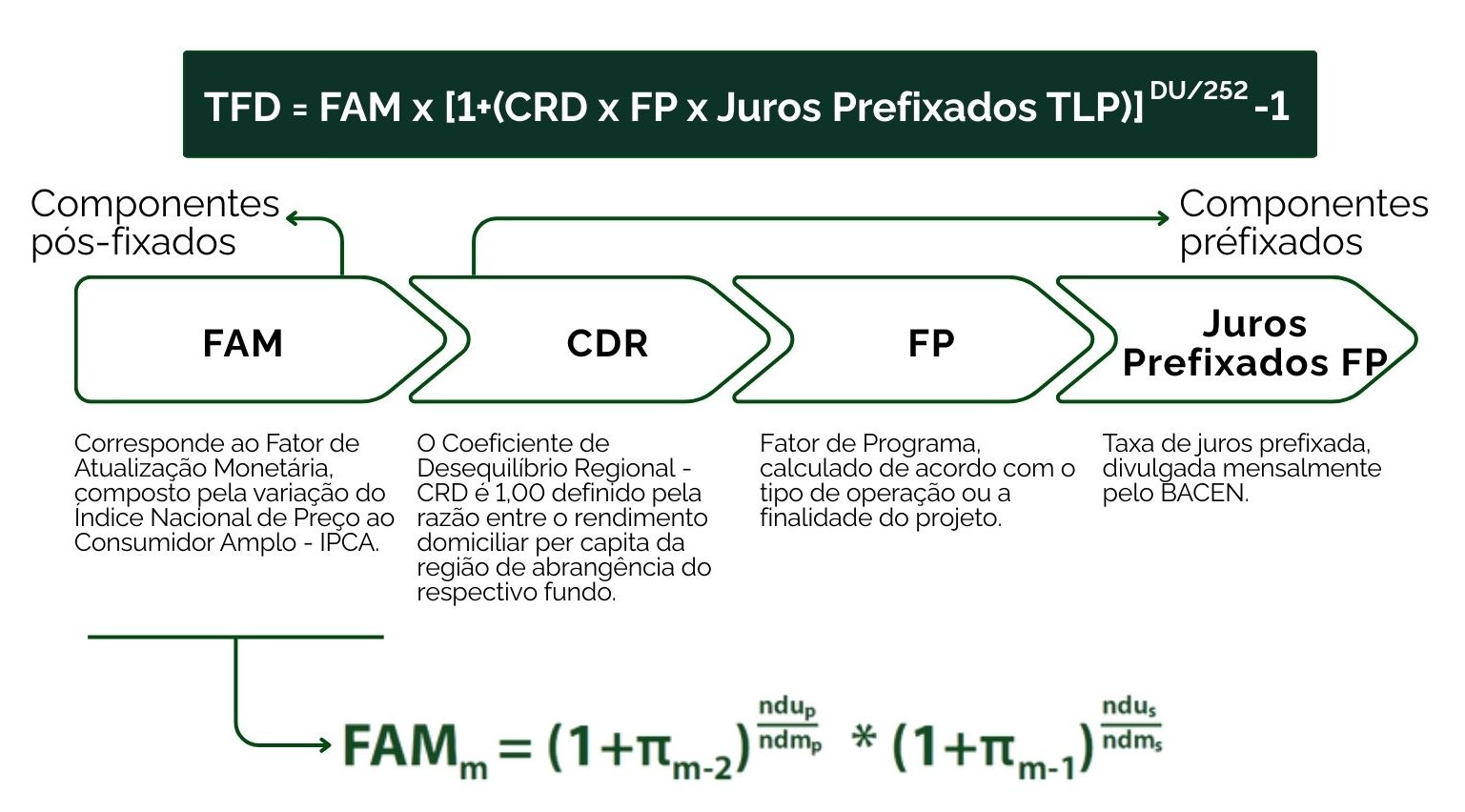 A Taxa efetiva de juros do Fundo de Desenvolvimento do Centro-Oeste (FDCO) será apurada mensalmente de acordo com a fórmula definida na Resolução CMN n.º 4.960, de 21 de outubro de 2021, da seguinte maneira:
