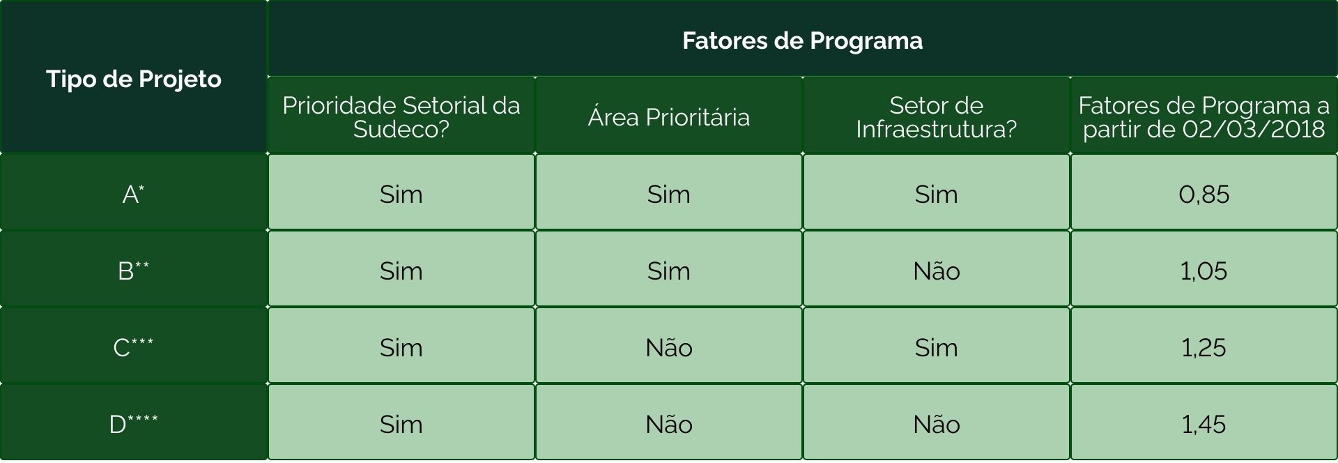 *Projeto Tipo A: Projetos de infraestrutura, localizados em áreas prioritárias (baixa ou média renda, faixa de fronteira ou RIDE) - Fator de Programa 0,85;