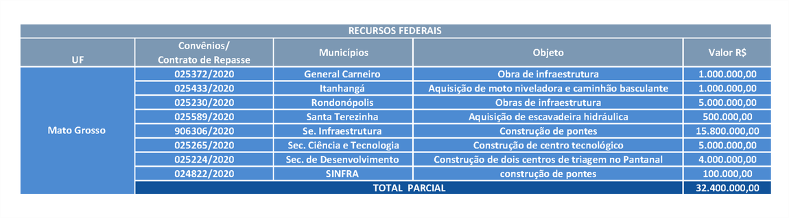 Do total de recursos, R$ 24 milhões atenderão projetos apresentados pelo governo do estado, como a construção de pontes pela Secretaria de Infraestrutura, que receberá R$ 15 milhões. O restante será investido na construção de um centro tecnológico, de um centro de triagem, conforme a tabela abaixo.