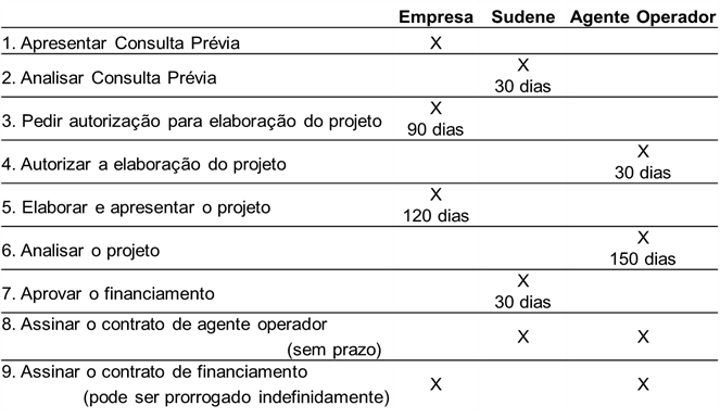 Prazo para realização dos serviços: As etapas de competência da Sudene têm prazo de até 30 dias.