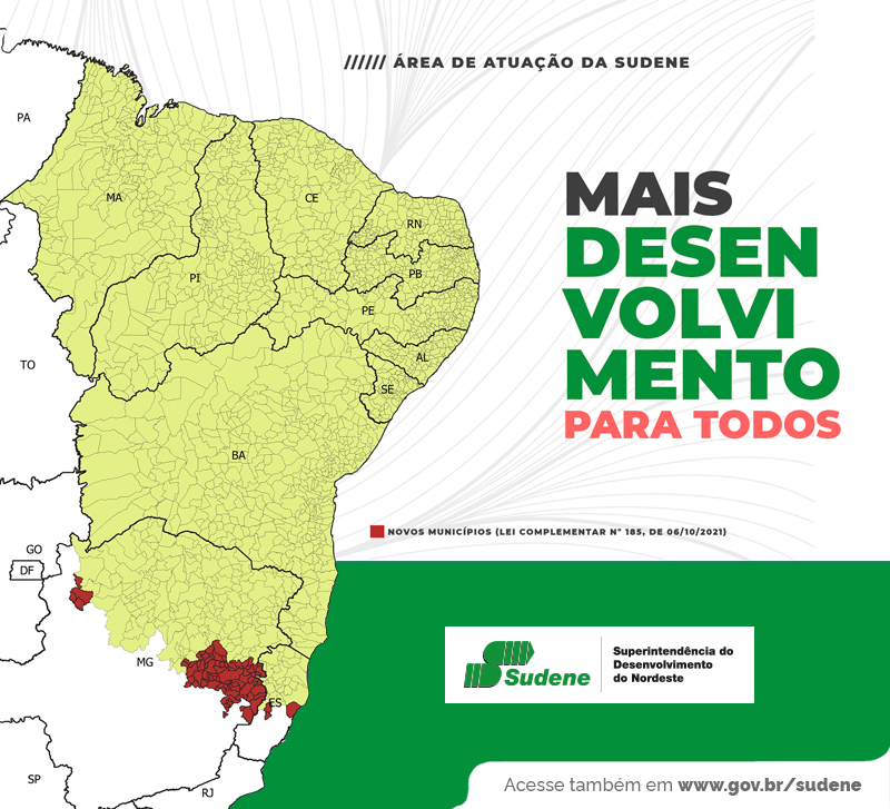 A área de atuação da Sudene está definida pela Lei Complementar nº 125, de 03 de janeiro de 2007, e suas alterações. O território é composto por todos os estados da região Nordeste do Brasil, além de 249 municípios dos estados de Minas Gerais e mais 31 municípios do Espírito Santo.