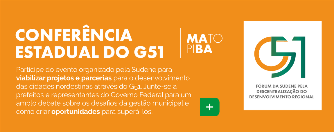 Participe do evento organizado pela Sudene para viabilizar projetos e parcerias para o desenvolvimento das cidades da região do Matopiba (Nordeste) que integram o G51 e o entorno delas. Junte-se a prefeitos e representantes do Governo Federal para um amplo debate sobre os desafios da gestão municipal, recuperação econômica e como criar oportunidades para promovê-la.