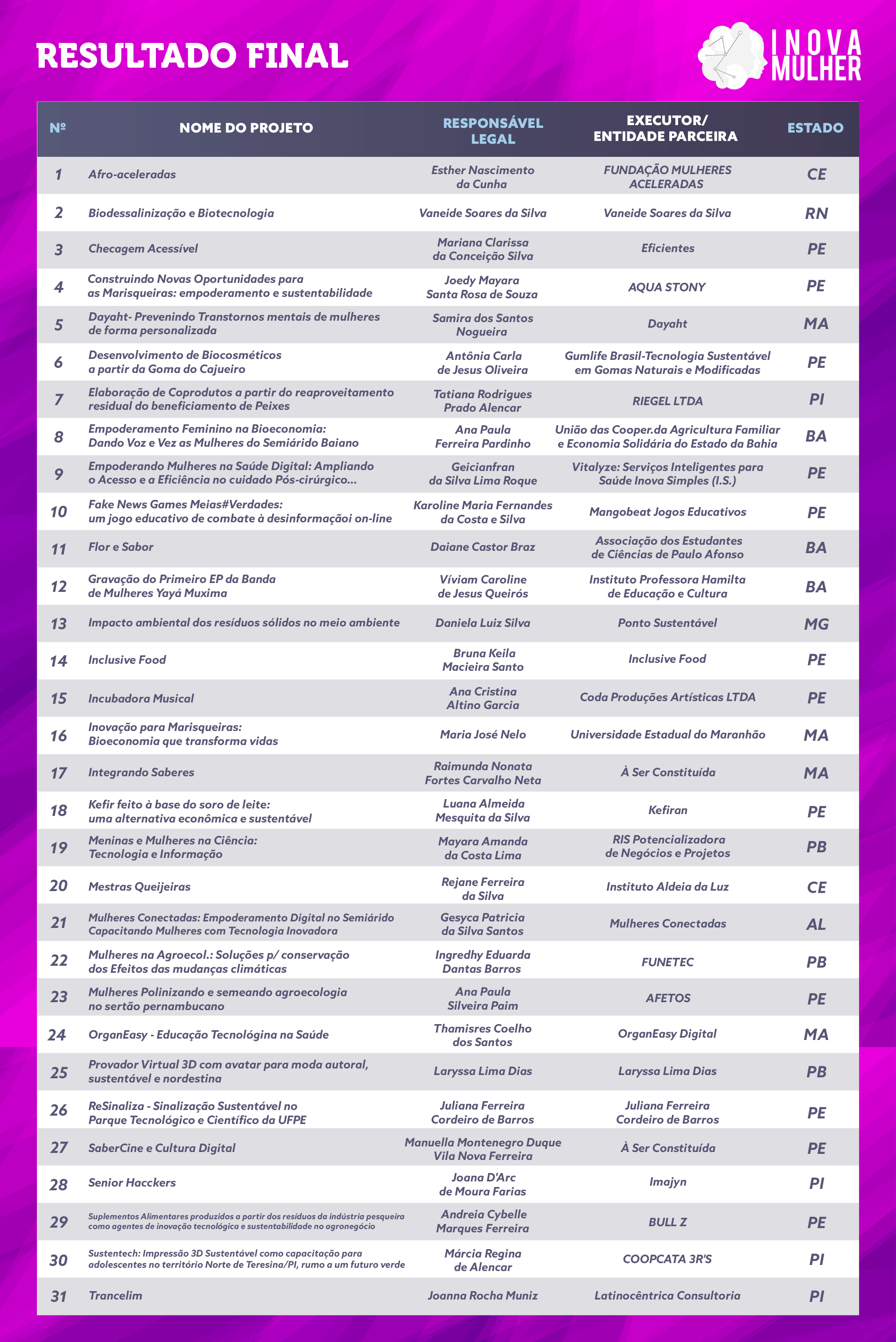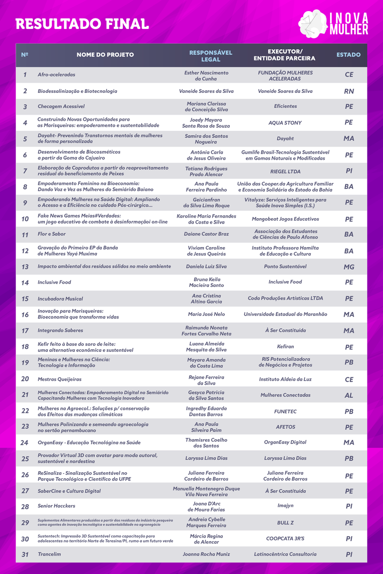 Relaciona o resultado alcançado pelos projetos apresentados em resposta ao Chamamento Público nº 01/2024 – Edital Inova Mulher nº 01/2024 | |