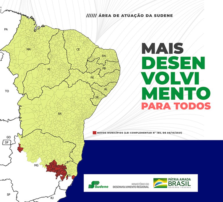A área de atuação da Sudene ganhou novos contornos. A edição desta quinta-feira (07/10) do Diário Oficial da União (DOU) traz a publicação da Lei Complementar nº 185, de 06 de outubro de 2021, que ampliou o território sob influência das ações da autarquia para 2074 municípios. Agora, mais 84 cidades de Minas Gerais e Espírito Santo passam a contar com os instrumentos de desenvolvimento regional oferecidos pela superintendência. A medida foi aprovada pelo Congresso Nacional e promulgada pelo presidente Jair Bolsonaro.