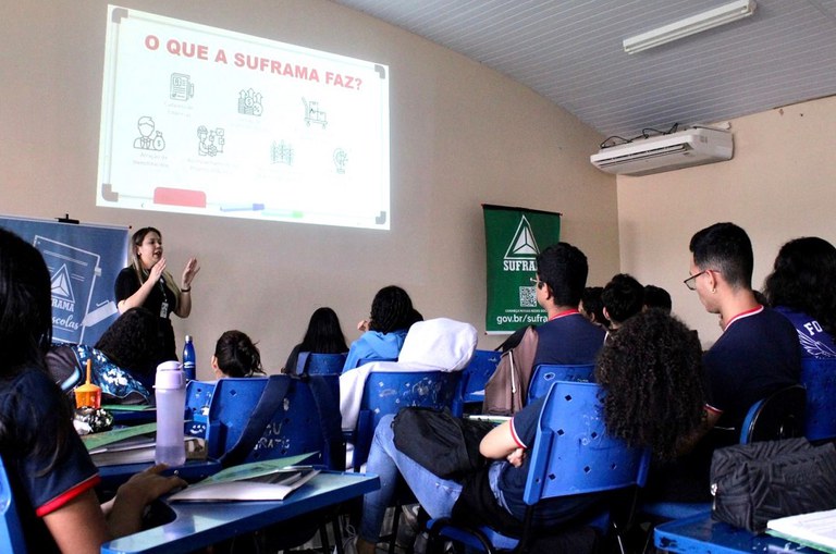 Um grupo de aproximadamente 50 alunos finalistas da Escola Estadual Karla Patrícia Barros de Azevedo, localizada no bairro Tarumã, zona Oeste de Manaus, participou, nesta segunda-feira (16), do projeto “Suframa nas Escolas”. Idealizado e coordenado pela Suframa, o programa oferece palestras informativas com o objetivo de compartilhar informações sobre a Suframa e a Zona Franca de Manaus (ZFM) com os estudantes do terceiro ano do ensino médio em escolas estaduais de Manaus. O propósito é destacar a importância de ambas para a região e para o país nos aspectos econômico, social, ambiental e tecnológico.