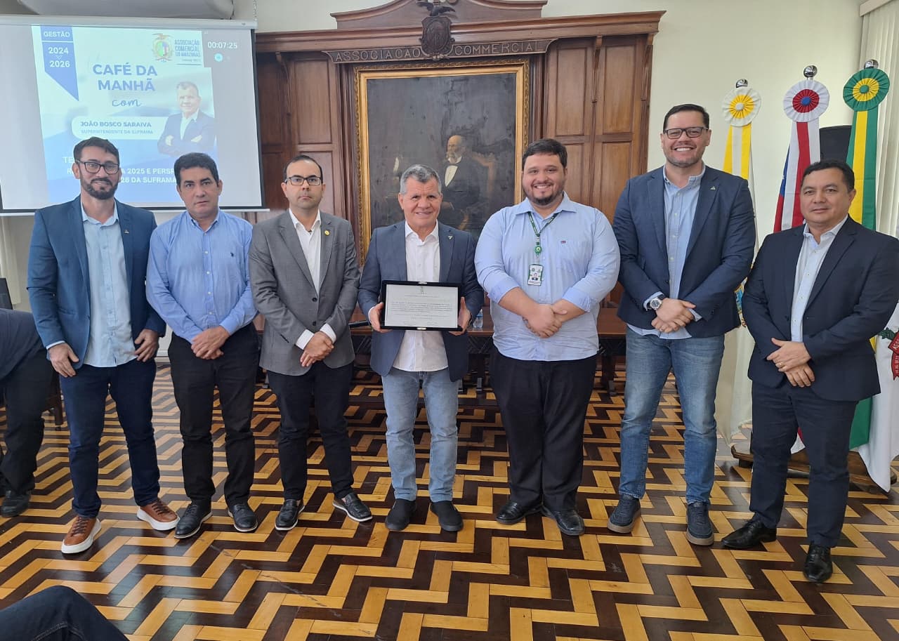 Ao final do encontro, a diretoria da Associação Comercial do Amazonas entregou uma placa comemorativa ao superintendente Bosco Saraiva e à sua comitiva, complementando a homenagem e reforçando a parceria histórica entre as duas entidades.
