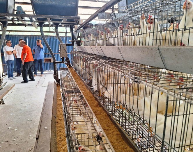 No quilômetro 30, já dentro da área do DAS, a visita percorreu os galpões onde ocorre o acompanhamento de evolução das galinhas, que é dividido nas fases pré-inicial (até 42 dias), crescimento (de 42 a 105 dias) e postura, quando começa a produção de ovos propriamente dita. Atualmente, o investimento abrange um total de 1,3 milhão de bicos.