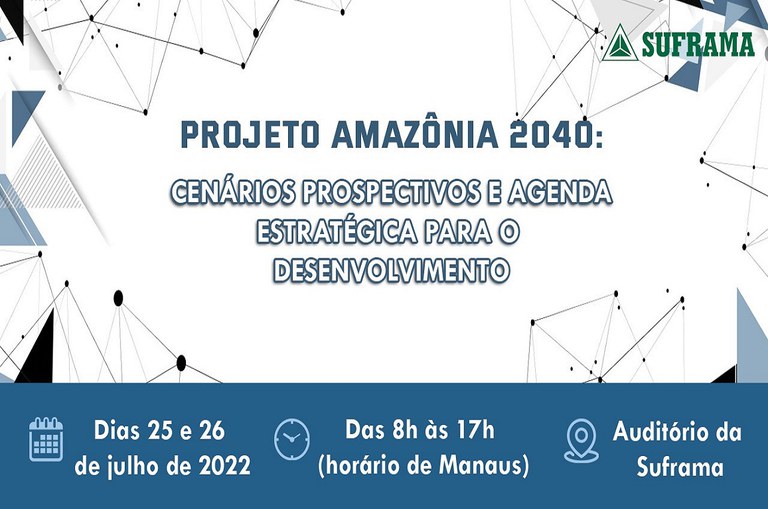 Nos próximos dias 25 e 26 de julho, a Suframa realizará evento visando à formalização da sua adesão ao projeto “Cenários BRASIL 2040” e também à realização de debates e oficinas de construção de cenários no contexto do projeto “Amazônia 2040: cenários prospectivos e agenda estratégica para o Desenvolvimento”, que é coordenado pela Autarquia.