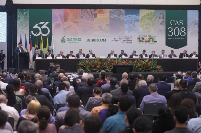 Em seu pronunciamento, o superintendente Marcelo Pereira fez uma contextualização histórica da criação e evolução da Zona Franca de Manaus, ressaltando que o objetivo para o qual ela foi instituída não foi a arrecadação de impostos, mas, sim, a extrafiscalidade, ou seja, induzir o desenvolvimento regional por meio da geração de atividade econômica. Ele também destacou a necessidade de valorização da Suframa e de seus servidores e ressaltou a importância da vinda do vice-presidente e ministro do MDIC a Manaus. “É uma honra receber o ministro e sua equipe, os conselheiros do CAS e ter uma plateia tão rica e extensa de parlamentares, empresários, entidades de classe, servidores da Suframa e demais atores e parceiros da Autarquia. Temos certeza que esta reunião ficará marcada na história da Zona Franca de Manaus e que todos os acontecimentos aqui ocorridos, incluindo os importantes anúncios sobre o CBA, terão repercussões muito positivas para o ambiente de negócios da região nos próximos anos”, afirmou Pereira.
