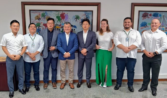 O superintendente da Suframa, Bosco Saraiva, acompanhando do superintendente adjunto Executivo, Frederico Aguiar, e do superintendente adjunto de Desenvolvimento e Inovação Tecnológica, Waldenir Vieira, reuniu-se na manhã desta sexta-feira (4), na sede da Autarquia, com uma comitiva de executivos e consultores da Samsung liderada pelo presidente da planta da empresa no Polo Industrial de Manaus (PIM), Cheolhyeong Cho.