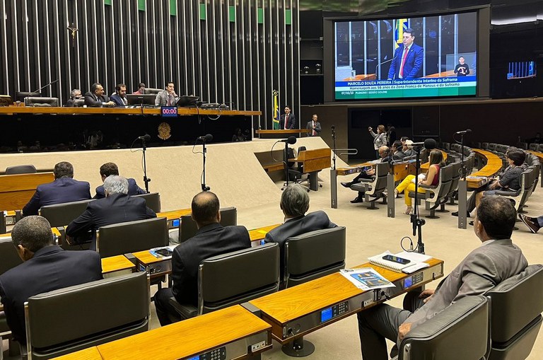 Os 56 anos do modelo Zona Franca de Manaus (ZFM) e da Suframa foram homenageados em sessão solene realizada na manhã desta terça-feira (7), no Plenário Ulysses Guimarães, na Câmara dos Deputados, em Brasília (DF). Durante o evento, parlamentares salientaram a relação entre a preservação da floresta amazônica e a consolidação da ZFM, destacaram a importância da valorização dos servidores da Autarquia e ressaltaram a necessidade da manutenção das vantagens fiscais do modelo no futuro modelo tributário brasileiro. A Autarquia foi representada no evento pelo superintendente, interino, Marcelo Pereira.