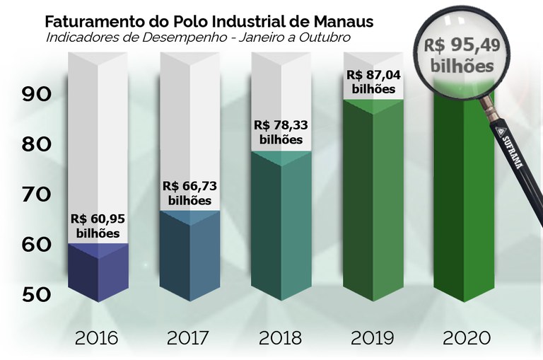 O Polo Industrial de Manaus (PIM) registrou faturamento de R$ 95,49 bilhões no período de janeiro a outubro deste ano, o que representa um aumento de 9,71% em relação ao mesmo intervalo de 2019 (R$ 87,04 bilhões). Em dólar, o faturamento do PIM no mesmo período somou US$ 18.24 bilhões, contra US$ 22.21 de janeiro a outubro do ano passado. Os dados são dos Indicadores Industriais do PIM, compilados pela Superintendência da Zona Franca de Manaus (Suframa).