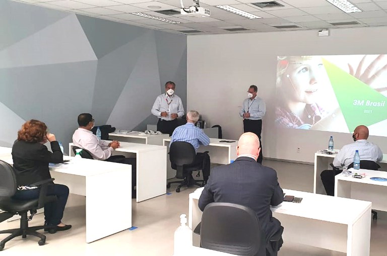 O presidente da 3M no Brasil, Marcelo Oromendia (em pé, à esquerda)recebeu a equipe da Suframa (Foto: Layana Rios/Suframa)