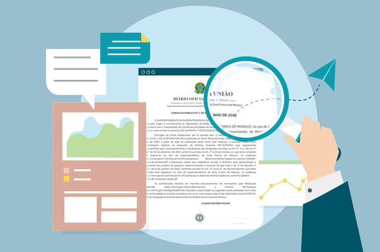 São dois temas objetos da Consulta Pública: uma minuta de Portaria Conjunta Ministério da Economia/Suframa e uma minuta de Resolução Capda (Ilustração: Fábio Alencar/Suframa)