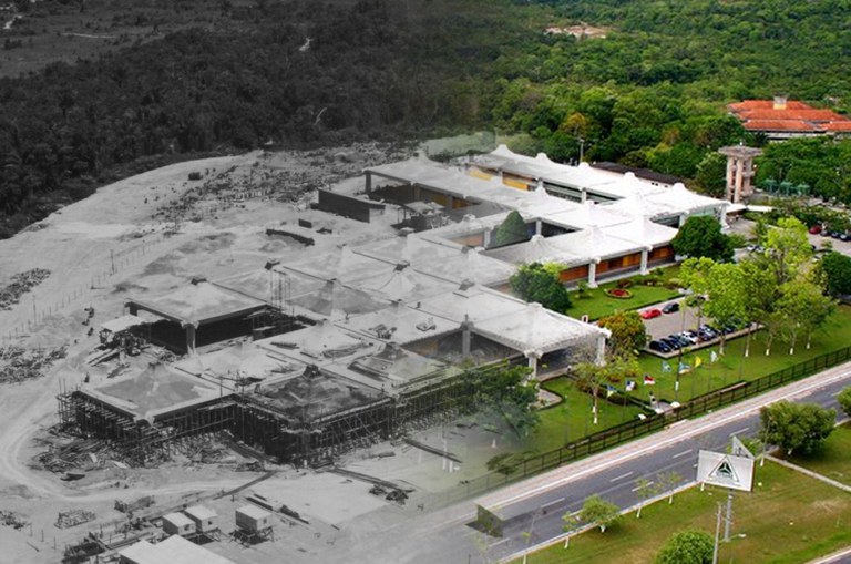 Prédio se destaca pelas cúpulas de concreto armado com ventilação por efeito chaminé e uma estrutura arquitetônica única na floresta amazônica (Fotos-montagem: Fábio Alencar/Suframa - Fotos: Divulgação/Suframa)