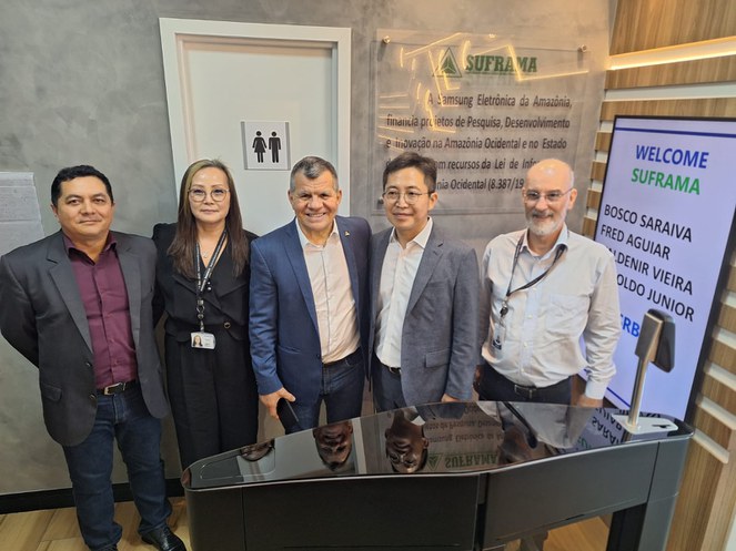 Bosco Saraiva e equipe técnica foram recebidos pelo diretor da Controladoria da Samsung/SRBR, Tar Hoon Cha; o diretor de PD&I, Fernando Campos Arruda; o gerente de PD&I e Relacionamento, Marcos Lima de Souza; a gerente sênior de Controladoria, Regina Lee; e o gerente sênior de PD&I, Eteocles Silva.