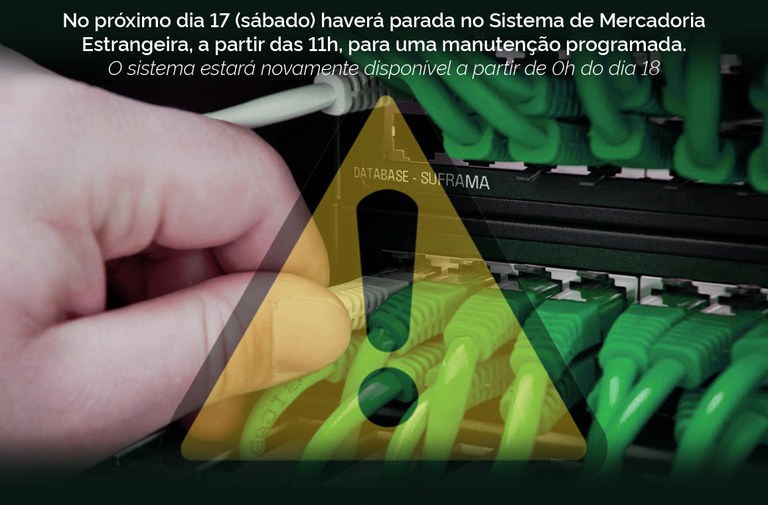 A Superintendência da Zona Franca de Manaus (Suframa) informa que no dia 17 de abril (sábado), entre 11h e 0h (horário de Manaus), o sistema de mercadoria estrangeira ficará indisponível para todos os usuários devido a uma manutenção preventiva promovida pela Coordenação-Geral de Modernização e Informática da Autarquia.