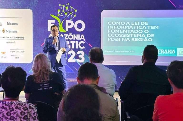O superintendente-adjunto de Desenvolvimento e Inovação Tecnológica, Waldenir Vieira, integrou a programação de palestras da ExpoAmazônia Bio&TIC 2023, nesta quarta-feira (29), apresentando como a Lei de Informática tem fomentado o ecossistema de Pesquisa, Desenvolvimento e Inovação (PD&I) da Amazônia Ocidental e Amapá. O evento ocorreu na sala 3 do Studio 5 Centro de Convenções.