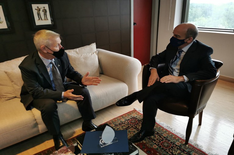 Superintendente da Suframa, Algacir Polsin, e presidente do TCE-AM, conselheiro Érico Desterro, discutem detalhes de potencial parceria (Foto: Diego Queiroz/Suframa)