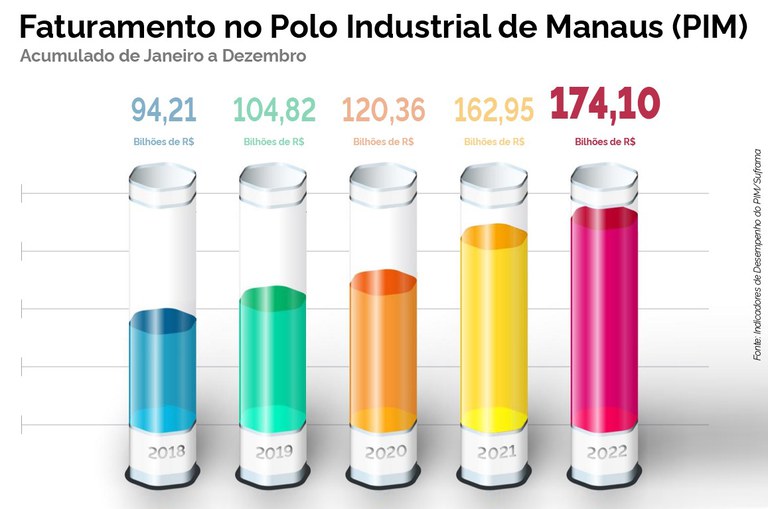 Ao faturar em 2022 o montante de R$ 51,33 bilhões, o polo de Bens de Informática permanece como subsetor com maior participação no resultado global de faturamento do PIM, respondendo por 29,49% do total. Outros segmentos de grande representatividade no PIM em 2022 foram o Eletroeletrônico, com faturamento de R$ 32,12 bilhões e participação de 18,45%; Duas Rodas, com faturamento de R$ 26,09 bilhões e participação de 14,99%; Termoplástico, com faturamento de R$ 15,07 bilhões e participação de 8,66%; Químico, com faturamento de R$ 14,75 bilhões e participação de 8,47%; Metalúrgico, com faturamento de R$ 13,73 bilhões e participação de 7,89%; e Mecânico, com faturamento de R$ 9,92 bilhões e participação de 5,70%.