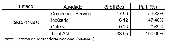 Os dados ajudam a refletir a importância do segmento de Comércio e Serviços para toda a região, uma vez que, nos estados analisados, essa atividade econômica liderou de forma absoluta os valores de internamento de mercadorias nacionais. No Estado do Amazonas, o setor de Comércio e Serviços, comprou R$ 17,60 bilhões em mercadorias nacionais internadas, isso representa uma participação de aproximadamente 52% no total.
