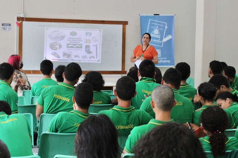Com a proposta de esclarecer o que é a Zona Franca de Manaus (ZFM) e a Suframa aos estudantes que estão concluindo o ensino médio na rede pública estadual, foi realizada nesta terça-feira (3) mais uma edição do “Suframa nas Escolas”. Aproximadamente 60 estudantes da Escola Estadual Ângelo Ramazotti, situada no bairro Adrianópolis, zona Centro-Sul de Manaus, participaram da atividade, que envolveu a apresentação de slides, exibição de materiais multimídia e a realização enquetes, para estimular a participação dos alunos e facilitar a compreensão dos temas.