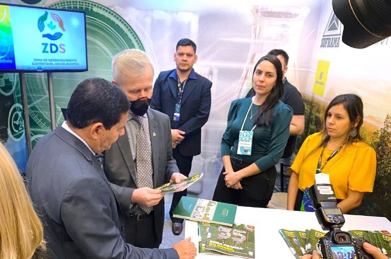 Vice-presidente Hamilton Mourão visitou o estande da Autarquia no evento (Foto: Isaac Júnior/Suframa)