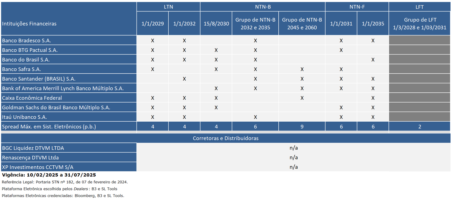 Abaixo, estão listadas as nove instituições financeiras atualmente credenciadas para atuar como dealers com o Tesouro Nacional (CODIP) e os respectivos títulos selecionados para negociação, além das três corretoras e distribuidoras: