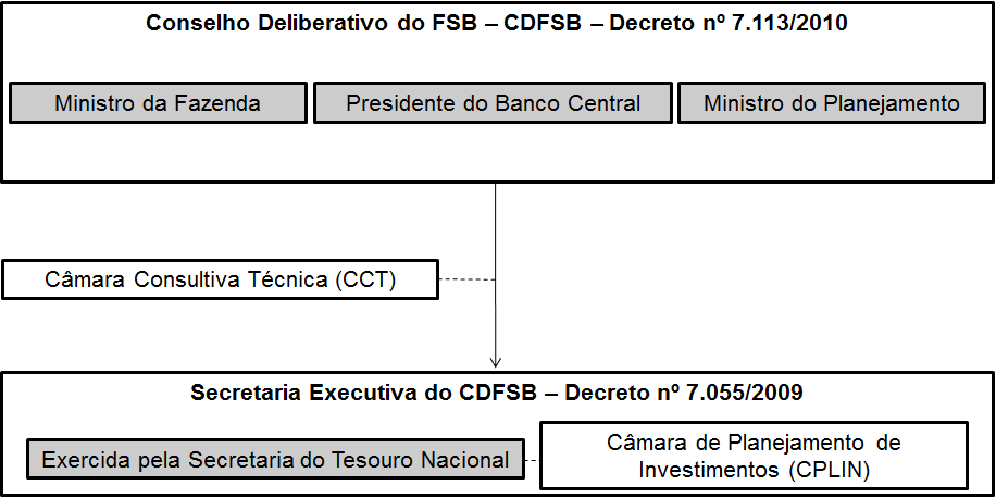 Conforme previsto no art. 6º da Lei nº 11.887, de 2008, o Decreto nº 7.113, de 2010, criou o Conselho Deliberativo do Fundo Soberano do Brasil. O Conselho será composto pelo Ministro de Estado da Fazenda que o presidirá, pelo Ministro de Estado do Planejamento, Orçamento e Gestão e pelo Presidente do Banco Central do Brasil.