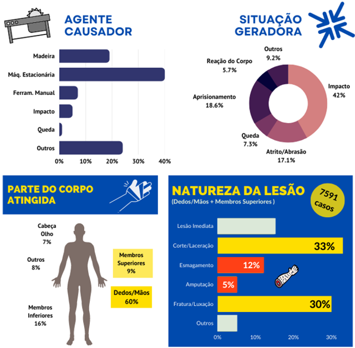 A análise dos dados de acidentes de trabalho do setor apontou que 40% ocorreram com máquinas estacionárias, tendo como principais situações geradoras impacto (42%), aprisionamento (18%) e atrito e abrasão (17%).