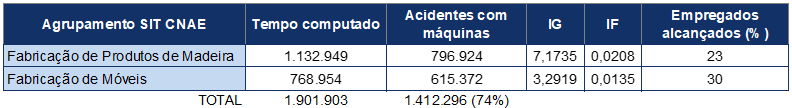 Dados do ano de 2021 apontaram que o setor de fabricação de móveis e de produtos de madeira possuem alto índice de gravidade e de frequência de acidentes, apesar disso possuem baixa cobertura de fiscalização recente (empregados alcançados nos estabelecimentos fiscalizados nos últimos três anos). Este setor emprega atualmente mais de 390 mil trabalhadores em 32 mil estabelecimentos dispersos por todo o Brasil.