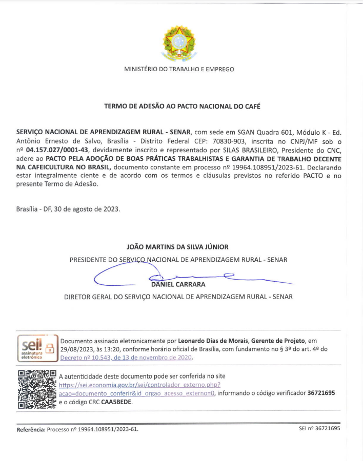 Pacto pela Adoção de Boas Práticas Trabalhistas e Garantia de Trabalho Decente na Cafeicultura no Brasil - Serviço Nacional de Aprendizagem Rural (SENAR).
