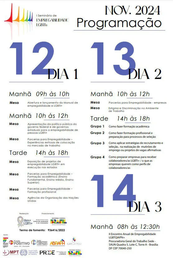 O Seminário é promovido pela Aliança Nacional LGBTI+ e Ministério dos Direitos Humanos e Cidadania, com apoio MTE, Ministério Público do Trabalho (MPT), Organização Internacional do Trabalho (OIT) e entidades representantes do público LGBTI+.