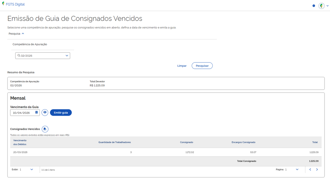 A partir da competência de apuração FEVEREIRO/2026, para simplificar e otimizar o processo de pagamento de valores do Programa Crédito do Trabalhador, o FGTS Digital permitirá o recolhimento, com encargos, de parcelas vencidas de valores retidos de consignado, conforme Portaria MTE nº 506/2026. Dessa forma, os empregadores deverão utilizar exclusivamente o FGTS Digital para realizar o pagamento de parcelas vencidas e a vencer.