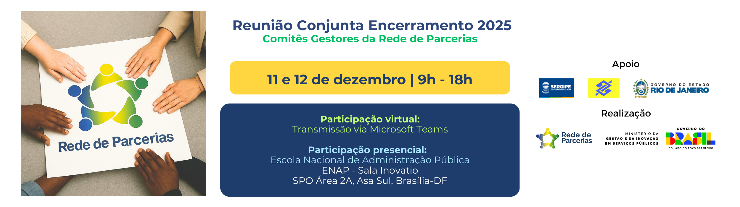 A reunião de encerramento do ano marca o processo de fortalecimento e ampliação da rede e reforça o seu compromisso coletivo com a eficiência e a transparência na gestão pública.Público-alvo: exclusivo aos coordenadores da Rede de Parcerias, multiplicadores do Transferegov.br e Gestaopublicagov.br e validadores externos do Gestaopublicagov.br.