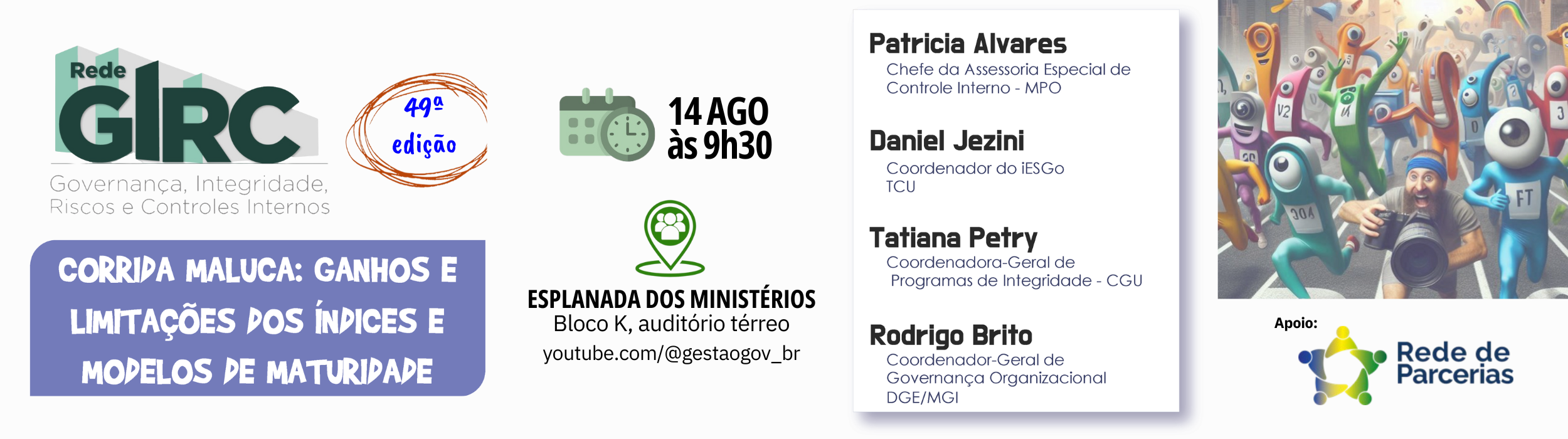 No próximo dia 14 de agosto, às 9h30, acontecerá a 49ª Edição da Rede GIRC - Governança, Integridade, Riscos e Controle, com o tema "Corrida maluca: ganhos e limitações dos índices e modelos de maturidade".
