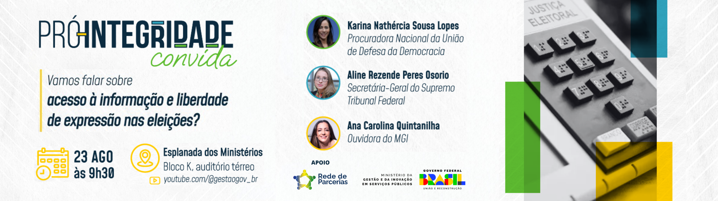 No dia 23 de agosto, acontecerá a 7ª Edição do Pró-Integridade Convida, que contará com 2 painelistas discorrendo sobre tema voltado a acesso à informação e liberdade de expressão no período eleitoral, com a curadoria da Ouvidoria do MGI.