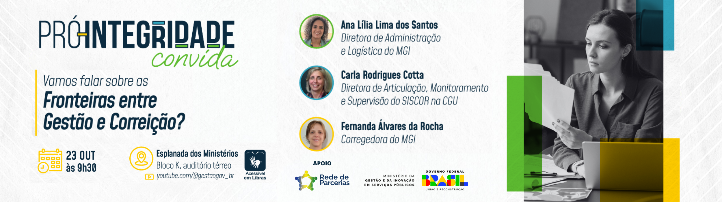 Local: Auditório térreo do Bloco K da Esplanada dos MinistériosTransmissão: Canal do MGI no YouTube.