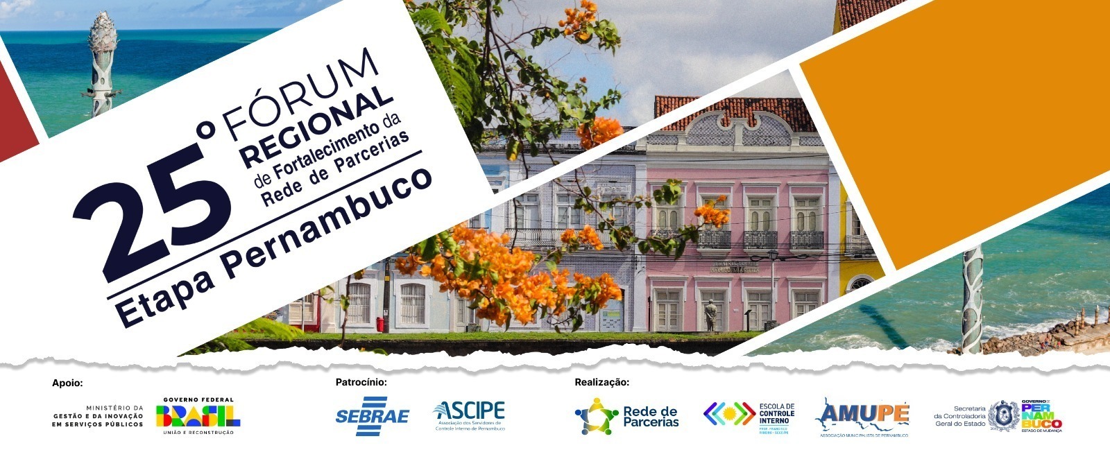 Governo do Estado de Pernambuco, por meio da Secretaria da Controladoria Geral do Estado de Pernambuco (SCGE/PE), e a Secretaria de Gestão e Inovação (SEGES), do Ministério da Gestão e da Inovação em Serviços Públicos, por meio da Diretoria de Transferências e Parcerias da União (DTPAR). Apoio da Associação Municipalista de Pernambuco (AMUPE) convida todos para o 25º Fórum Regional de Fortalecimento da Rede de Parcerias - Etapa Pernambuco.