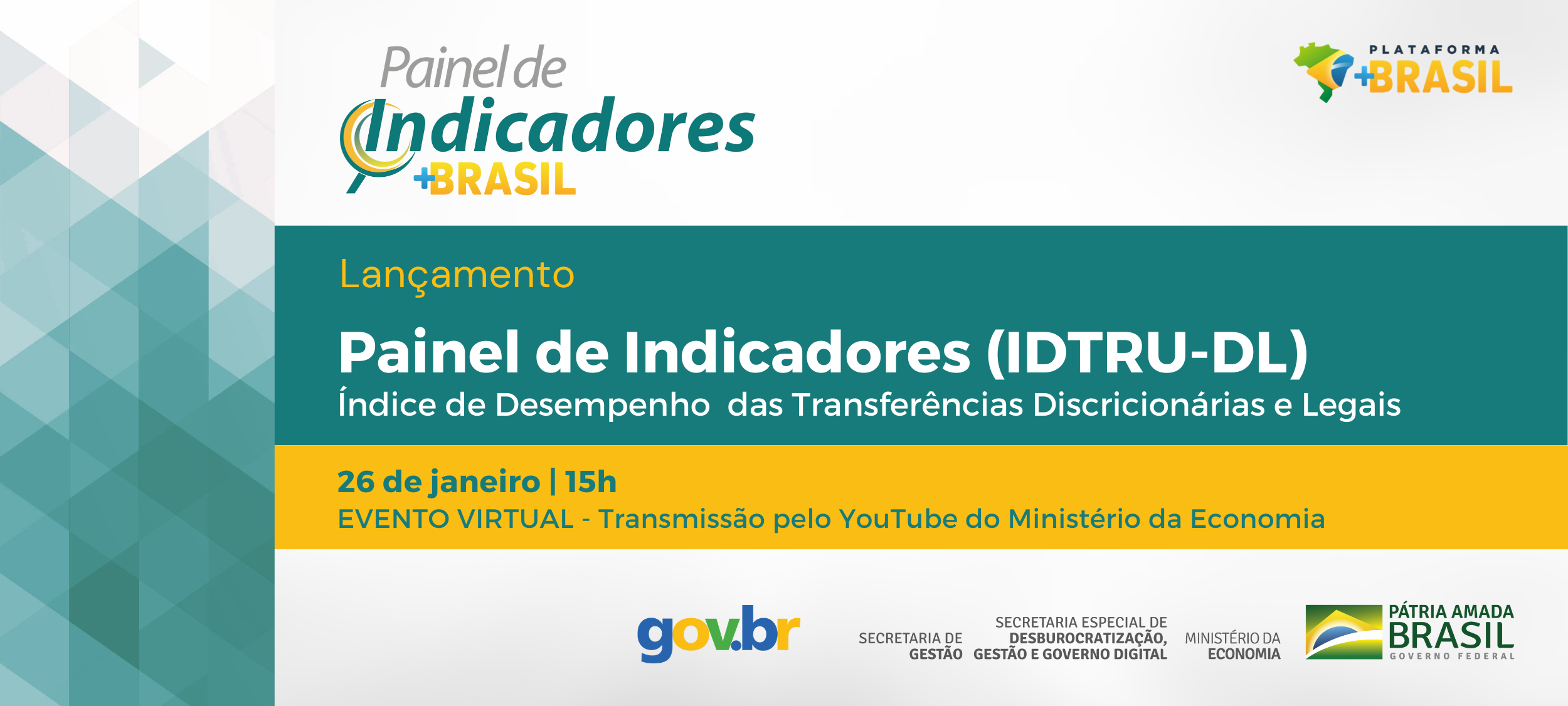 A Secretaria de Gestão do Ministério da Economia lança nesta quarta-feira (26), às 15h, o Painel de Indicadores (IDTRU-DL). O evento será transmitido ao vivo no canal do Youtube do Ministério da Economia. Não perca!