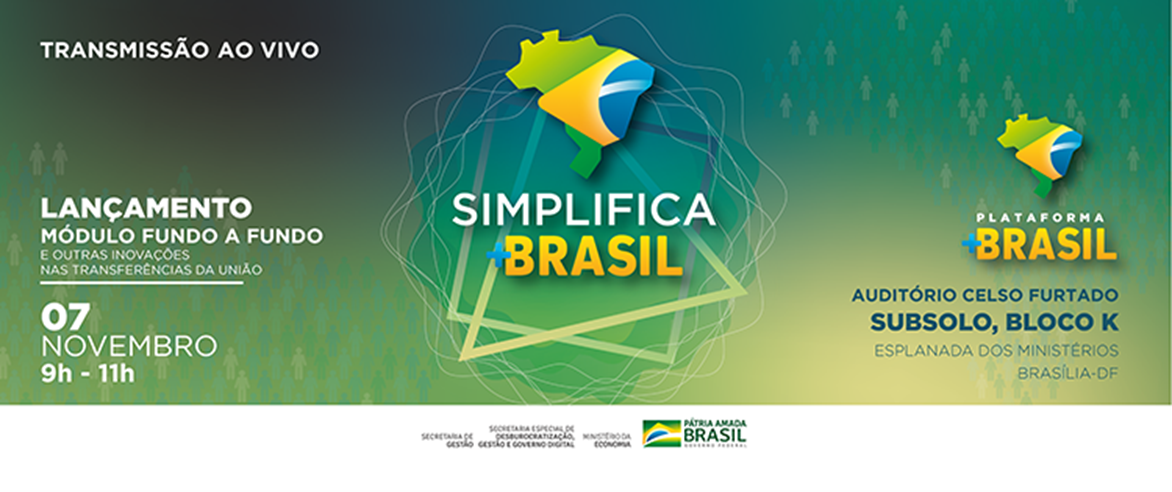 O Ministério da Economia, por meio da Secretaria Especial de Desburocratização, Gestão e Governo Digital, representada pelo Departamento de Transferências da União/DETRU têm a honra de convidá-lo para o evento Simplifica +BRASIL: inovações nas Transferências da União.